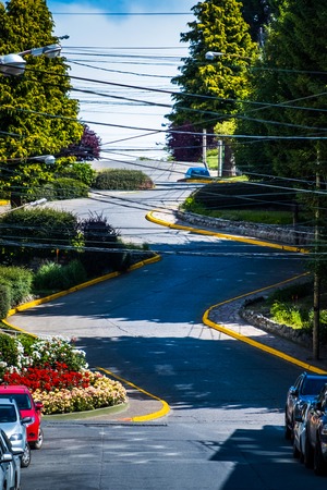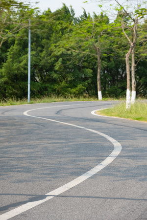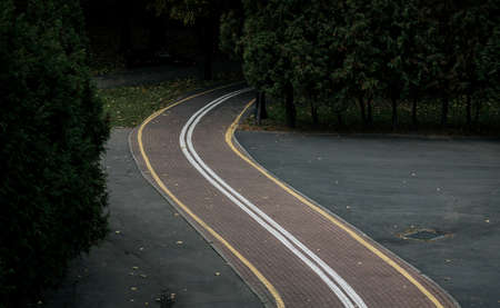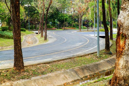 The street S-shape in public park with concrete gutters and tree surrounded background. Asphalt road S-shape style in the garden