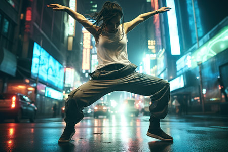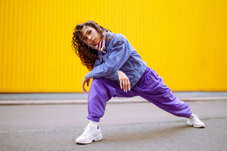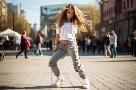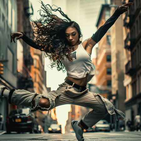 Beautiful young woman dancing hip-hop in the city streets.