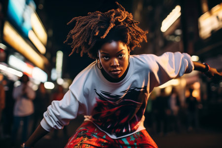 Beautiful african american woman with long curly hair, wearing a hat and jeans, dancing in the street.