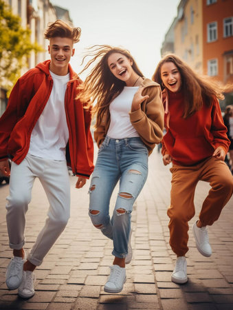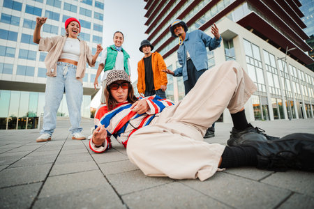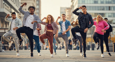 Dynamic group of enthusiastic friends celebrating an urban lifestyle with energetic poses and expressive gestures showcasing their passion for