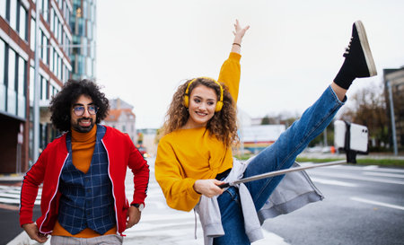 Young couple with smartphone making video for social media outdoors on street.