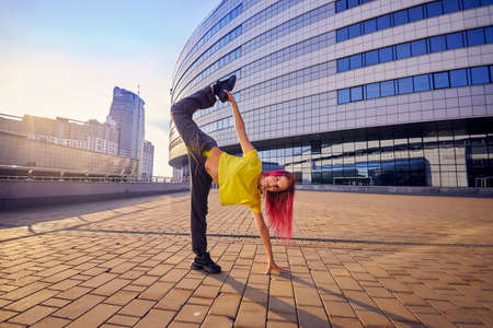 Young sporty dancer dancer in the street at sunset. Sport, dancing and urban culture concept.