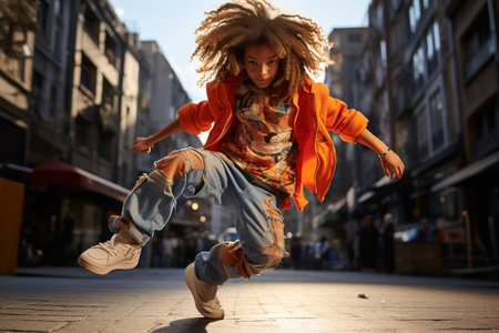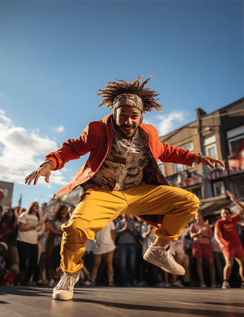 Energetic dancer performing hip hop moves in an urban setting, showing his talent and passion for street dance