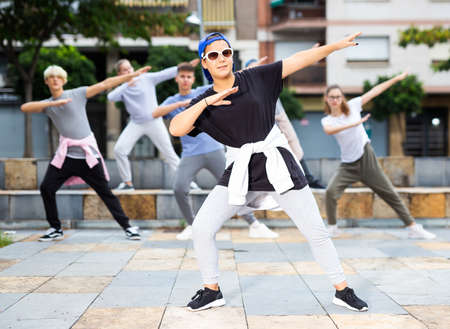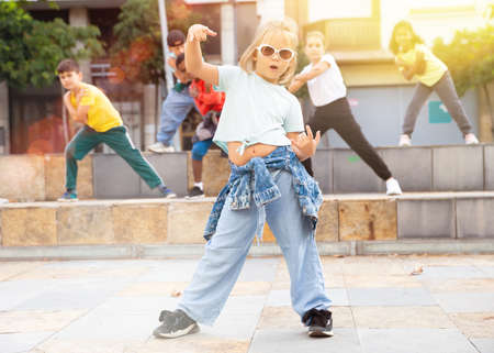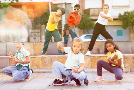 Active girls and boys dancing hip hop on a street