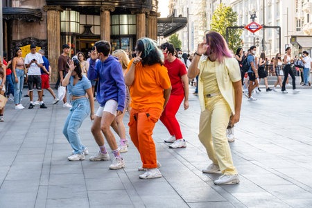Group of Young Adults Dancing in Gran Via Street in Madrid