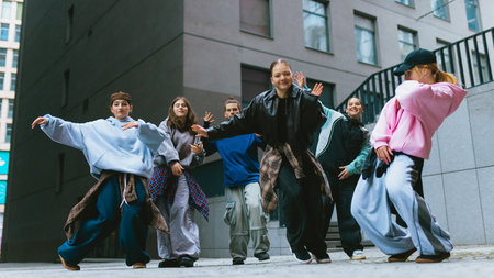 Urban youth dance group posing outdoors in modern city setting. Concept of youth culture promotion, street dance, urban lifestyle and dynamic visuals for media use.