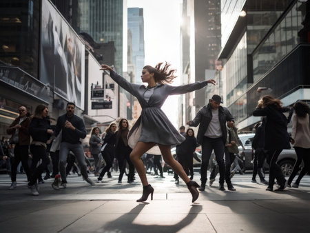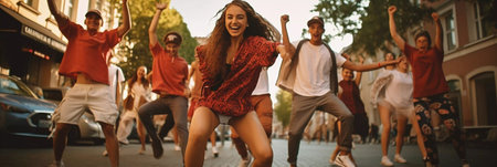 A group of young people are dancing and jumping on a street. Scene is energetic and fun