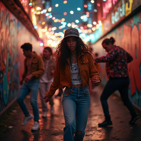 Young dancers and their instructor showcasing hip hop moves while practicing in an energetic urban environment filled with creativity