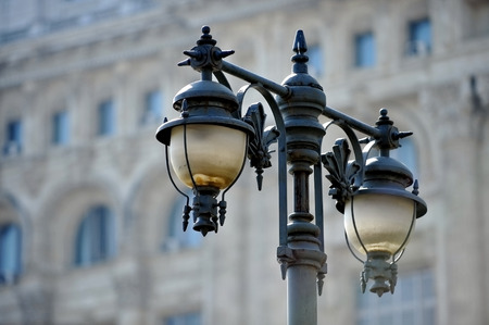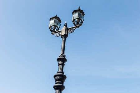 Retro vintage Beautiful forged figured metal black outdoor lamp with glasses, blue clear sky background, copy space. Street lighting equipment, electric savings, power industry, technology. Design