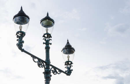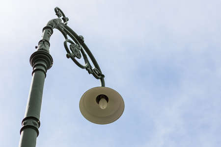 A beautiful street lamp on a background of a gray sky. Patterned lamp shade. Antique.