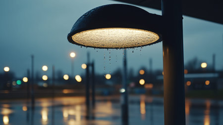 A street lamp casts a warm light during a rainy evening, with blurred city lights in the background.