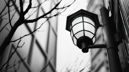 A street light casts a warm glow amidst decorative bulbs in the evening sky. A serene urban scene captures the essence of tranquility and charm.