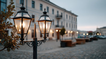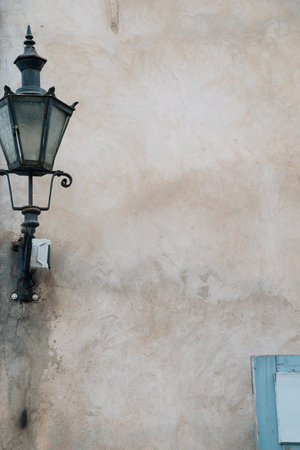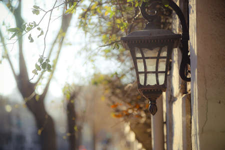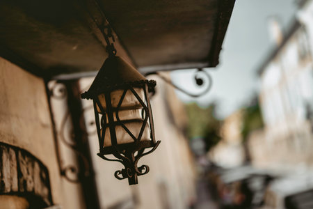 Vintage wrought iron lantern with frosted glass hanging from a building awning, casting a warm glow and evoking a nostalgic feeling in an antique European street scene
