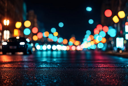 Colorful background of night street with bokeh blurred light cars and street lamps. Abstract backdrop of defocused lights at city life. Concept of cityscape backgrounds for design. Copy text space
