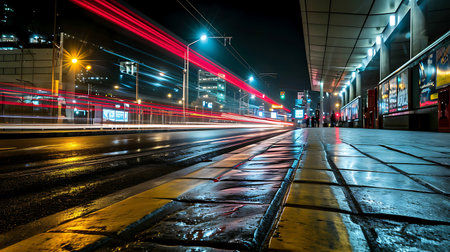 A vibrant long exposure shot of a city street at night, showcasing the blurred trails of vehicle lights in red and blue, reflecting on the wet asphalt.