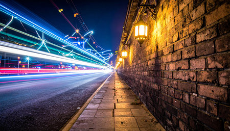 The timeless beauty of a historic street is enhanced by the dynamic movement of car light trails
