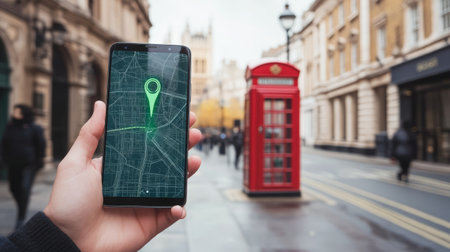 Hand holding smartphone displaying navigation map with location pin in london city center, blurred red telephone booth and pedestrians in the background