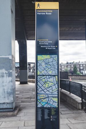 London/UK-22/07/2019: Information board on Harrow Road under the Westway. Helpful information about locations, landmarks and time you need to reach the destination, provided to help to visit the city
