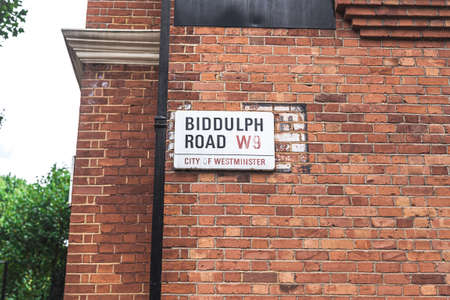 London/UK-30/07/18 Biddulph Road name sign, Maida Vale.The area is noted for its wide tree-lined avenues, large communal gardens and red-brick mansion blocks from the late Victorian and Edwardian eras