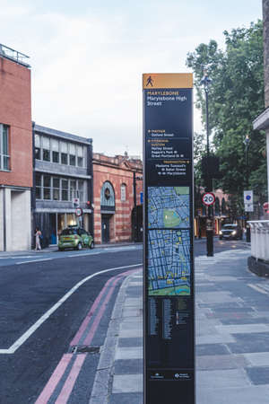 London/UK-26/07/18: Information board on Marylebone High Street. Helpful information about locations, landmarks and time you need to reach the destination, provided to help to visit the city