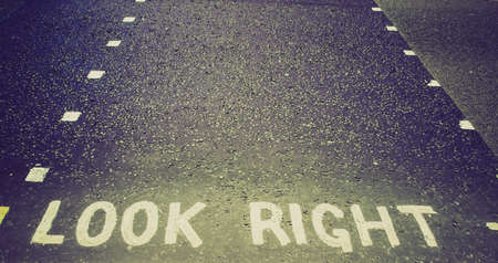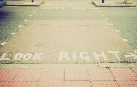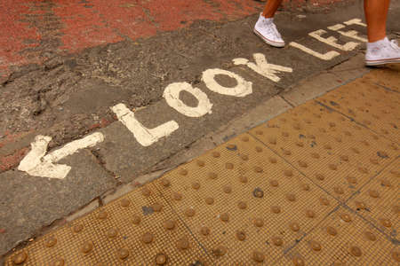 Vintage looking Look Left warning at a pedestrian zebra crossing in a London street