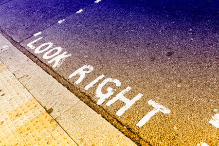 London UK pedestrian sign - look right at a pedestrian crossing. Traffic warning.
