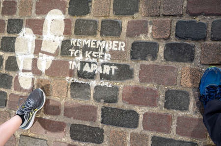 LONDON - SEPTEMBER 14, 2020: Feet obeying a Social Distancing sign painted on old brick floor at Camden Market during Covid 19 pandemic