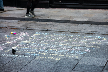 Yellow Kiss inscription painted on asphalt at the drop off parking station in Zug, Switzerland