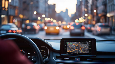 A person navigating through a busy urban street using a GPS navigation system. The image captures the dynamic city environment during evening traffic, showcasing modern technology in cars.