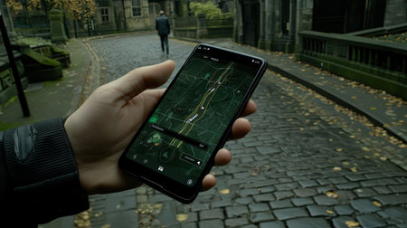 A person holds a smartphone displaying a navigation app on a cobblestone street, highlighting modern technology for urban exploration and travel.