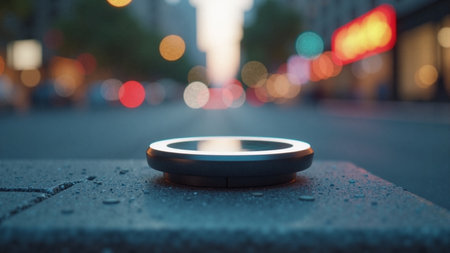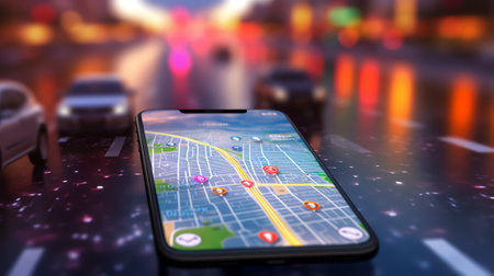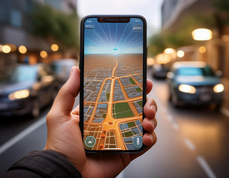 Modern smartphone displaying navigation app with augmented reality features, providing real time directions on car dashboard while driving through busy city streets