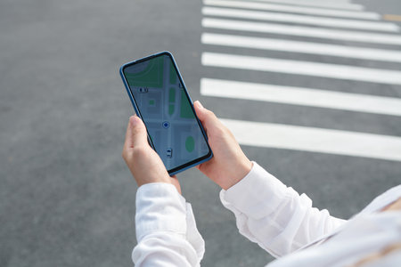 Close up of Tourist using GPS map navigation on smartphone application screen for direction to destination address in the city with travel and technology concept.