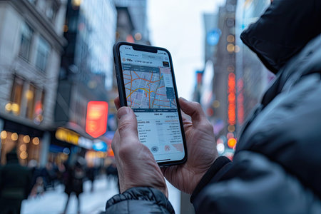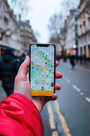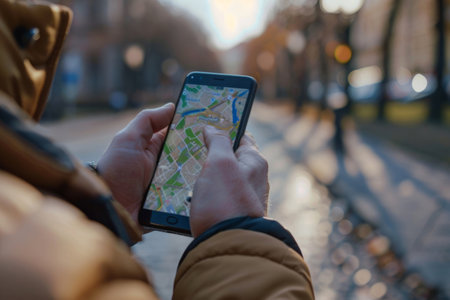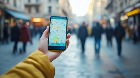 Tourist using a mobile phone with a map application, navigating through the bustling streets of a vibrant city while enjoying an exciting urban journey filled with discovery