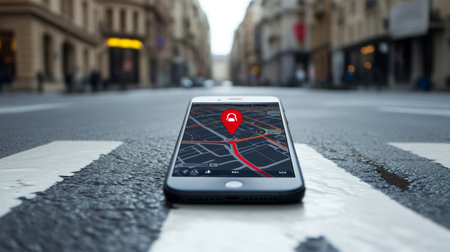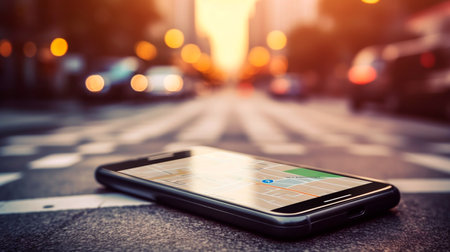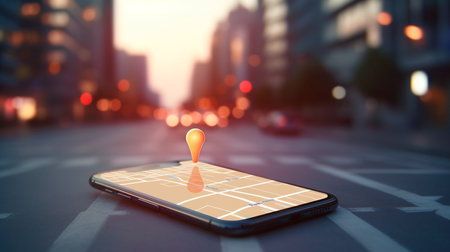 GPS-enabled mobile phone with navigational waypoints. Generative AI with a blurry city background