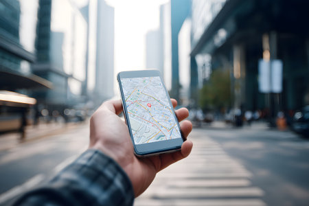 Generative AI : Hand using smartphone searching location on satellite navigation application and network connection over traffic transportation in city internet of things satellite