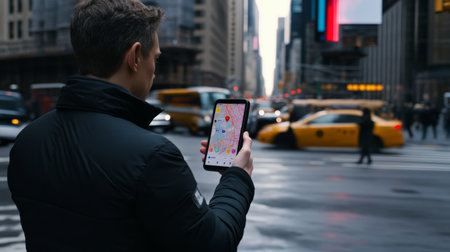 Businessman holding smartphone displaying navigation app with map of new york city, standing on busy city street with yellow cabs and traffic