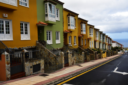 Spain, Canary Islands, Tenerife, colorful terraced houses in street that all look similar in the mountain village La Orotava with Atlantic ocean in background