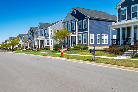 This image showcases a row of modern suburban homes with well-manicured lawns, gardens, and a clean street under a clear blue sky, representing suburban tranquility and community living. AI generated image