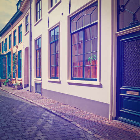 Colored facade of houses, windows with black shutters, green bushes, road near houses, horizontal