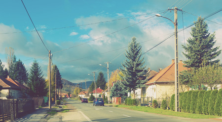 The view of the street with the line of residential houses of Pissouri village in the evening light. Limassol district. Cyprus