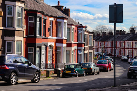 London, UK - March 22, 2020: Car drives past cars parked on both sides of a street in Palmers Green, a suburban area of the London Borough of Enfield in North London, England.