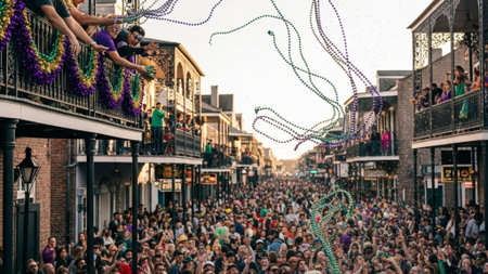 Mardi Gras parade on Bourbon Street, New Orleans. Festive crowds, balconies.