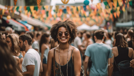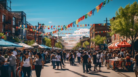 Someone enjoying a summer festival with crowds of people and colorful decorations. with Generative AI