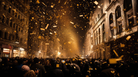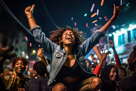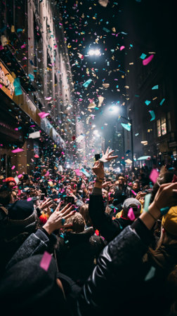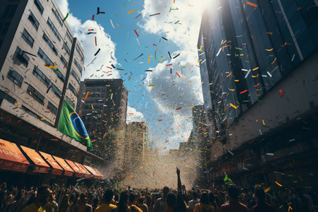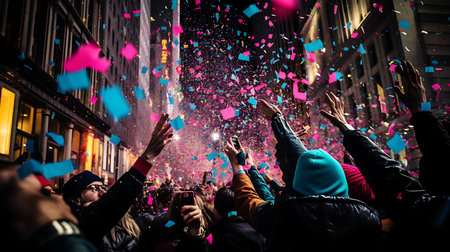 colorful confetti being thrown into the air by crowd of people, created with generative ai