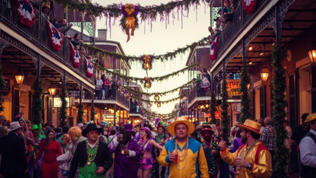 Mardi Gras celebration in the French Quarter of New Orleans USA. Concept Carnival Masks, Colorful Beads, Street Performers, Jazz Bands, Float Parades