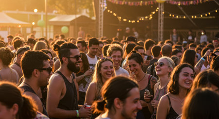 A vibrant crowd enjoys a summer music festival. People are smiling, cheering, and enjoying the live performance in a festive and energetic atmosphere.