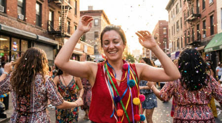 A happy woman with a bright smile dances in the middle of a city street during a festive celebration. She is surrounded by other people enjoying the party at sunset.