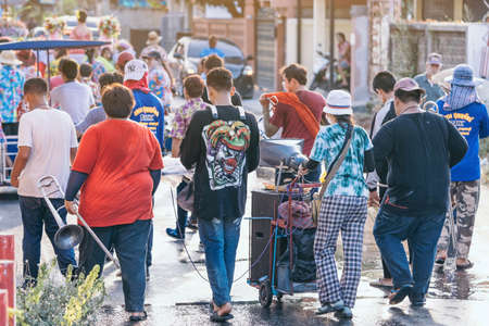 KANCHANABURI, THAILAND - APRIL 17,2019: Jazz music parade of Thai happiness people wearing colorful clothes in famous Songkran Water Festival on April 17, 2019 in Kanchanaburi, Thailand.