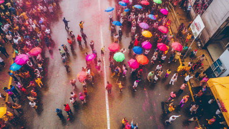 Generative AI : Aerial view of people celebrating the holy colour festival in the street in Barsana Uttar Pradesh India