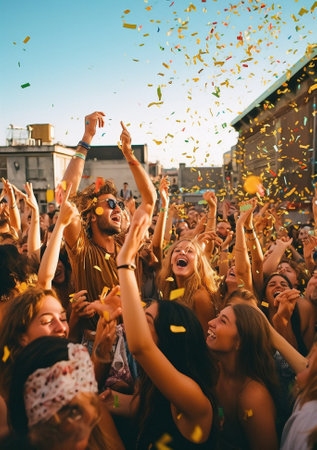 A diverse group of people celebrate an event outdoors. They are smiling and raising their arms as confetti falls around them. The composition features warm colors, suggesting a sunny day. This image may be used for various commercial purposes, including marketing and advertising campaigns.